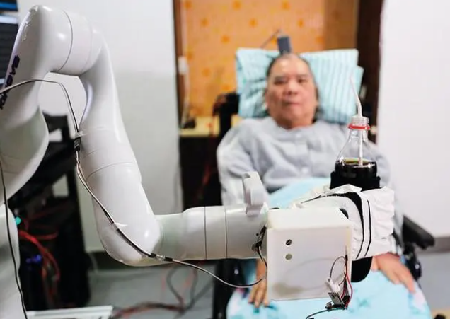 一名高位截瘫患者通过脑机接口控制机械臂,重获进食、握手等运动能力