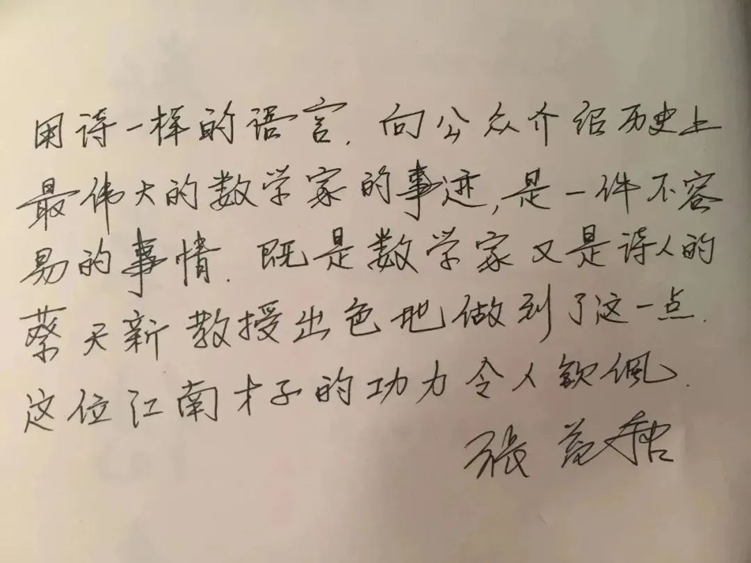 张益唐为本书亲笔撰写的推荐语称,“用诗一样的语言,向公众介绍历史上最伟大的数学家的事迹,是一件不容易的事情。即是数学家又是诗人的蔡天新教授出色地做到了这一点。这位江南才子的功力令人钦佩。”