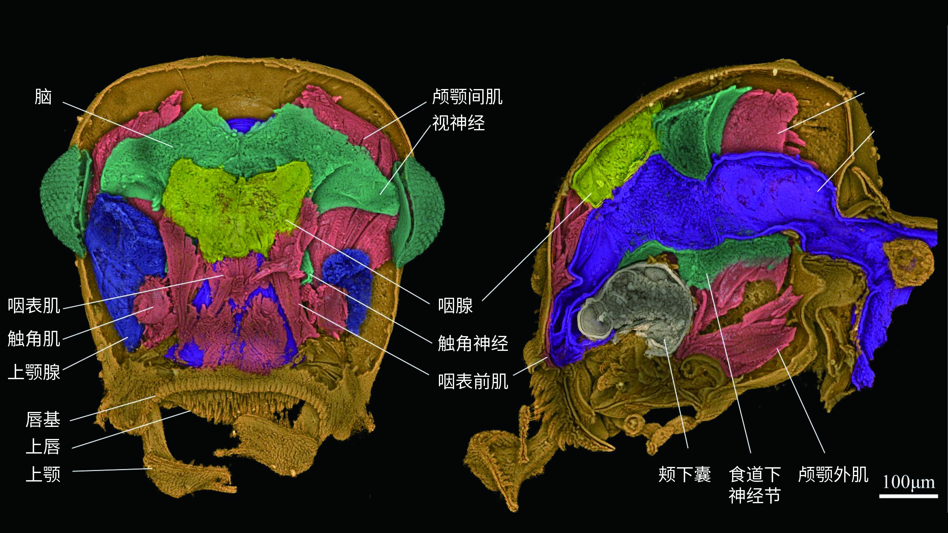 “我们的扫描精度非常高,结果非常好。尽管这只古蚂蚁的头部只有不到1毫米宽,我们却获得了包括近乎完整脑在内的丰富头部信息,其中的肌肉和腺体也非常完整。”许雯婧说。