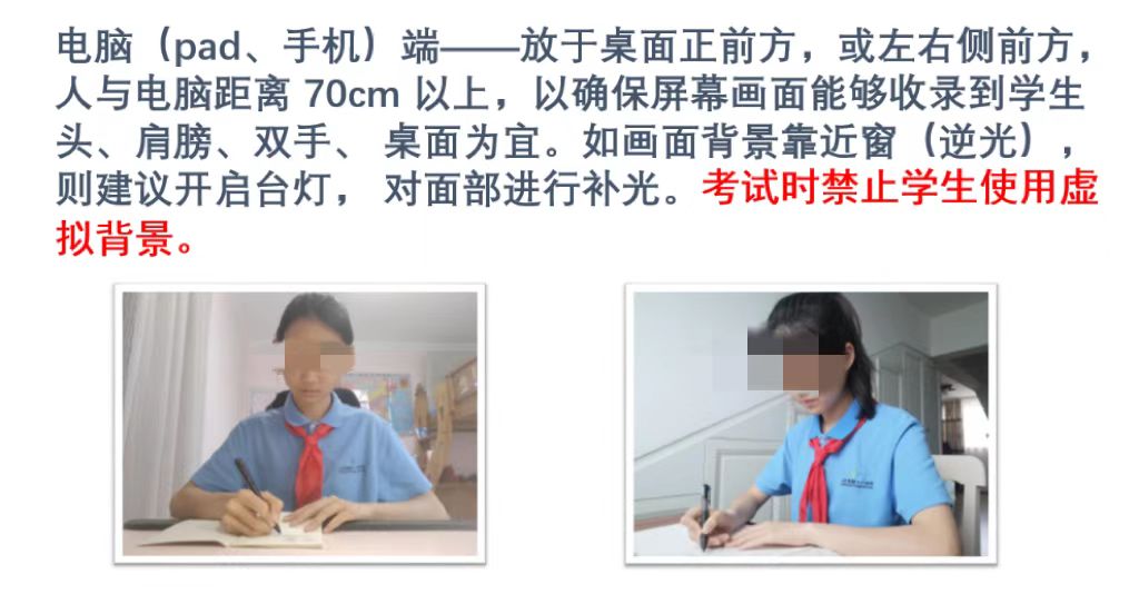 据介绍,线上考试期间,老师们将通过线上平台监考,摄像头拍摄的位置,要求拍摄的范围,均有严格的规范,各校已经将相关的操作说明提前同步给了家长和学生。比如“桌子上不摆放与测试有关的教材、教辅材料”“学生全程出镜”“摄像头对准学生头、手、卷面”等。