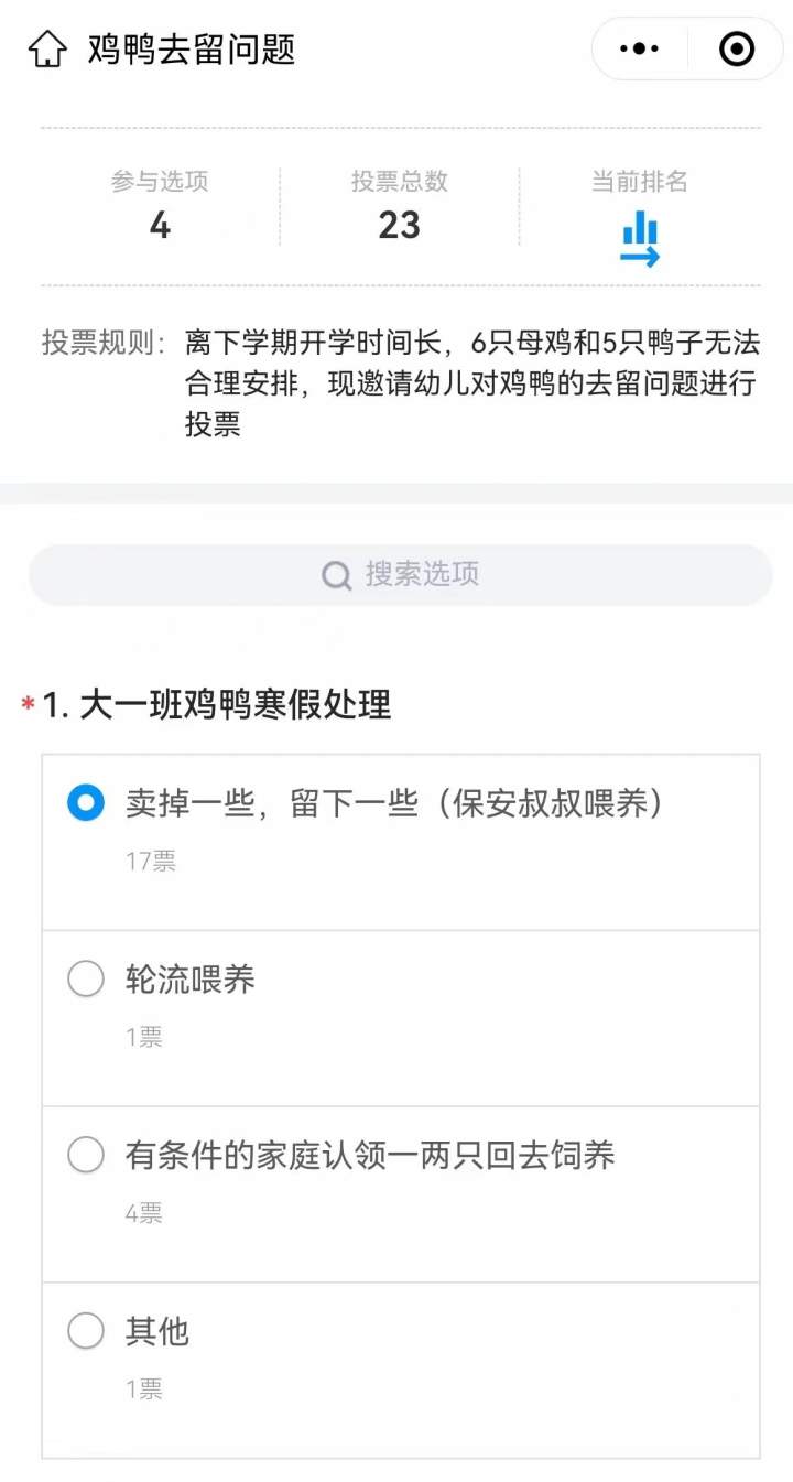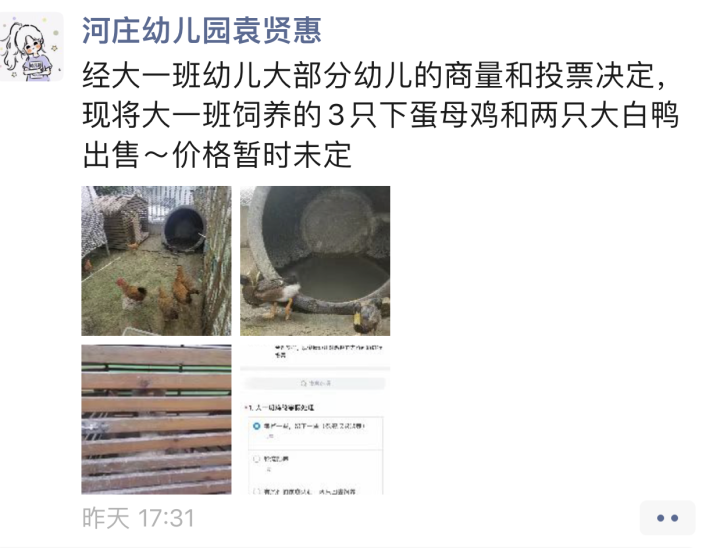 更让小朋友和袁老师伤心的是,因为笼子太小,已经有两只鸡死了。没办法了,袁老师就在班级里发起了云投票,请班级里的孩子们决定动物们的去留。大多数孩子选择了“卖掉一些,留下一些拜托保安叔叔喂养”。