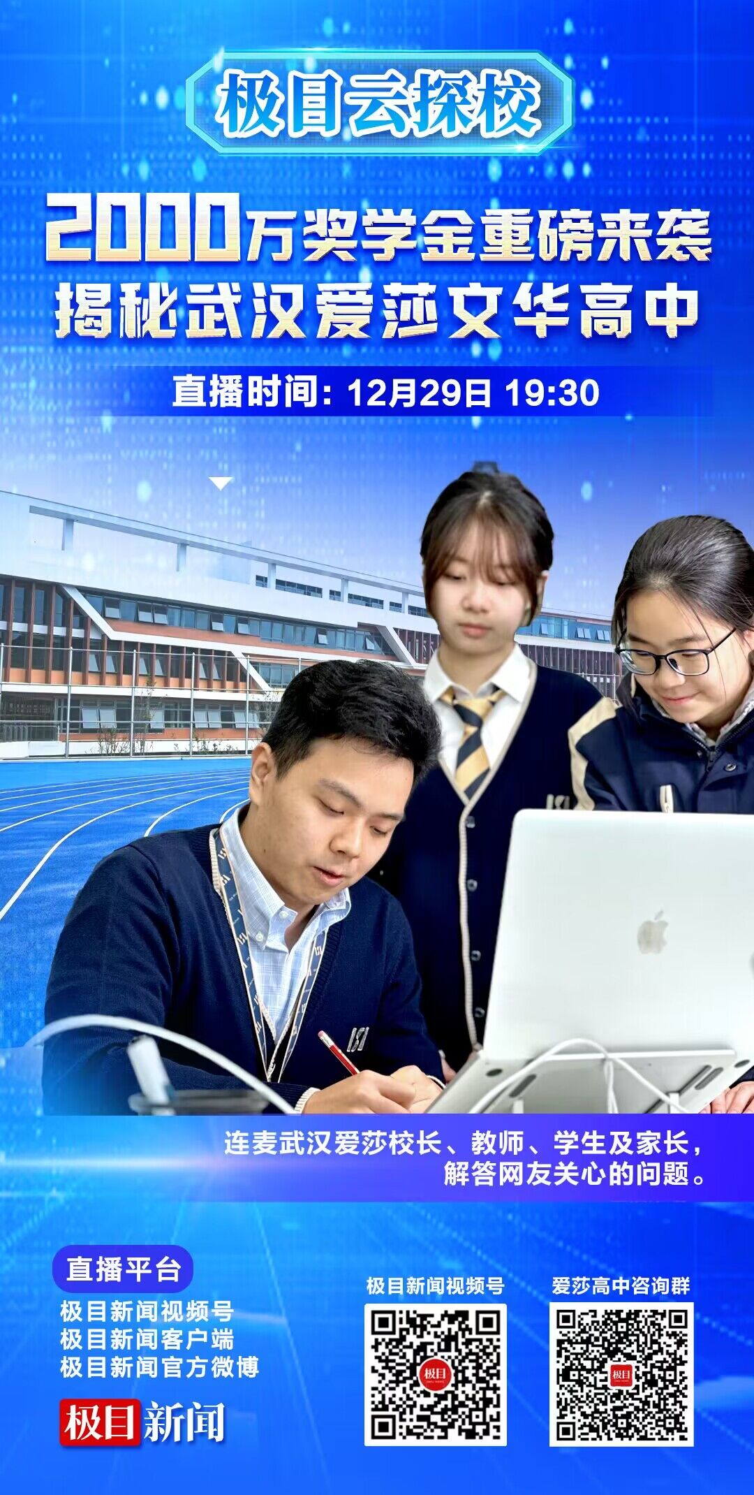 12月29日19:30,极目新闻“极目云探校”栏目将连线武汉爱莎文华高级中学副校长、AP课程中心执行校长贾茜博士,学校招生官,详细介绍这所备受瞩目的新兴学校。同时,为全面、客观解答网友对于选学校、选课程的疑问,节目还将邀请武汉爱莎文华高级中学多位在校学生及家长参与,通过视频连麦解答网友关心的问题。