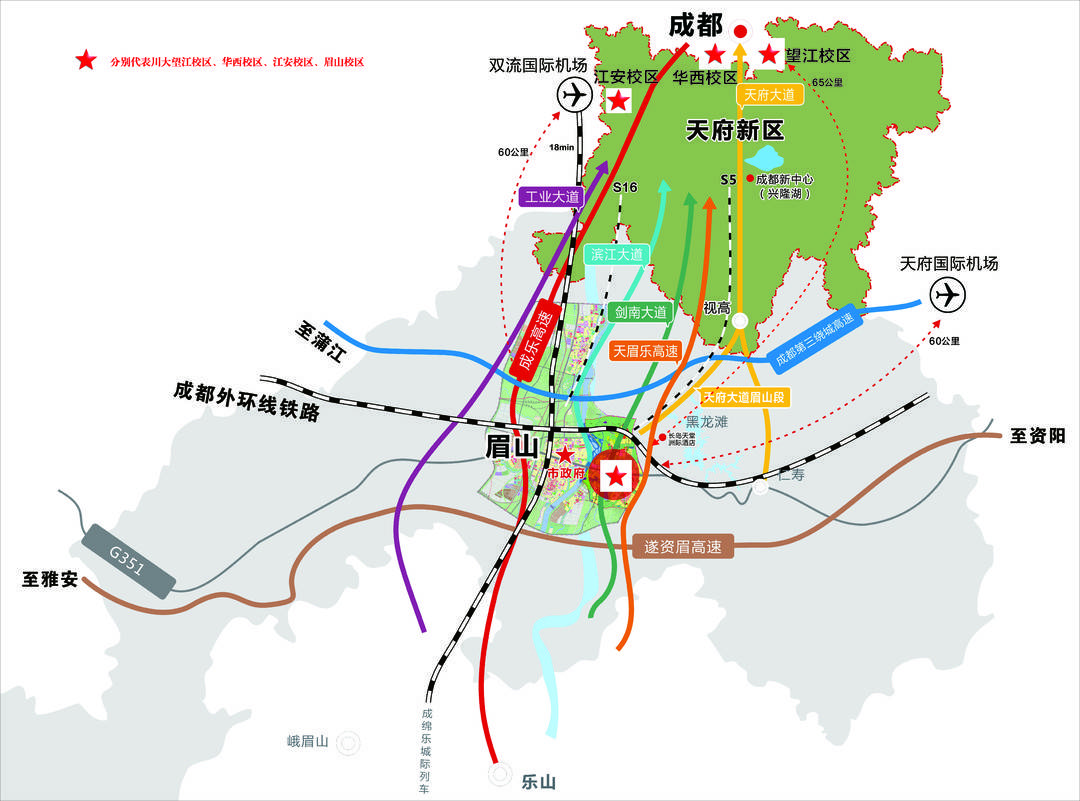 眉山市岷东新区管委会主任黄世文介绍,四川大学眉山校区于2020年12月31日获教育部正式批复同意,2021年1月14日眉山市与四川大学正式签约。“项目选址在岷东新区东部组团(岷东大道以东、岷黑快速通道以南相应地块),规划总用地面积约3000亩,其中一期约1000亩。项目一期投资规模约32亿元,建筑面积约30.7万平方米,将建设新技术研发与技术中试平台、高水平学科交叉平台、人文社科研究基地(东坡书院)及国际合作交流基地和教育培训中心等。”黄世文说,“项目距离双流和天府两个机场的距离,都是60公里。正在建设的S5成眉市域铁路岷东站,距离川大眉山校区3公里。”