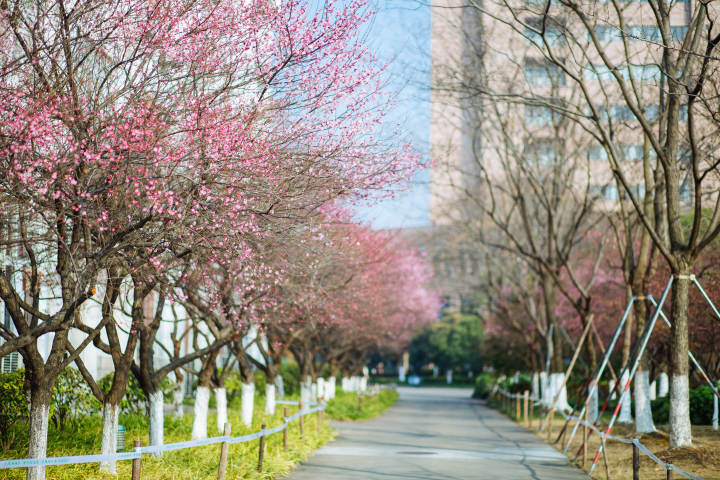 热爱摄影和关注杭电视频号的人都知道,一年四季,杭电校园可谓将“彩色”发挥到了极致。春天的红梅、晚樱、玉兰,再晚一些是紫藤,接着是校园里诸如香泡、橘子、火柿挂满枝头。到了秋天,南大门附近科技馆前的银杏林,和学林街上的红枫,屡屡成为师生摄影作品和下沙市民短视频里的主角。
