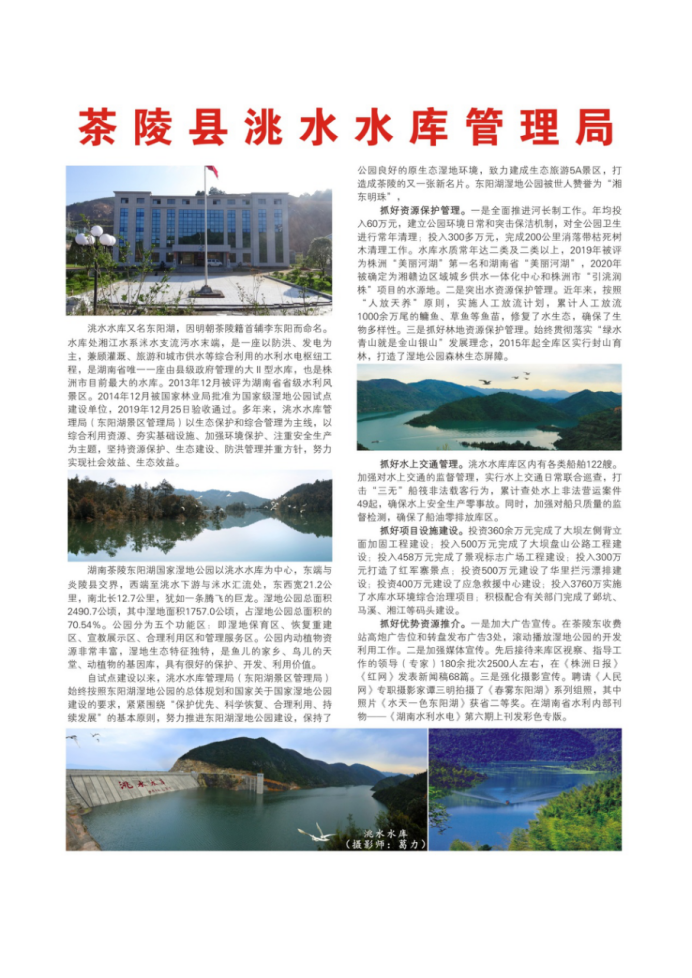 抓好优势资源推介。加大广告宣传。在茶陵东收费站高炮广告位和转盘发布广告3处,滚动播放湿地公园的开发利用工作。加强媒体宣传。先后接待来库区视察、指导工作的领导(专家)180余批次2500人左右,在《株洲日报》《红网》发表新闻稿68篇。强化摄影宣传。聘请《人民网》专职摄影家谭三明拍摄了《春雾东阳湖》系列组照,其中照片《水天一色东阳湖》获省二等奖。在湖南省水利内部刊物——《湖南水利水电》第六期上刊发彩色专版。