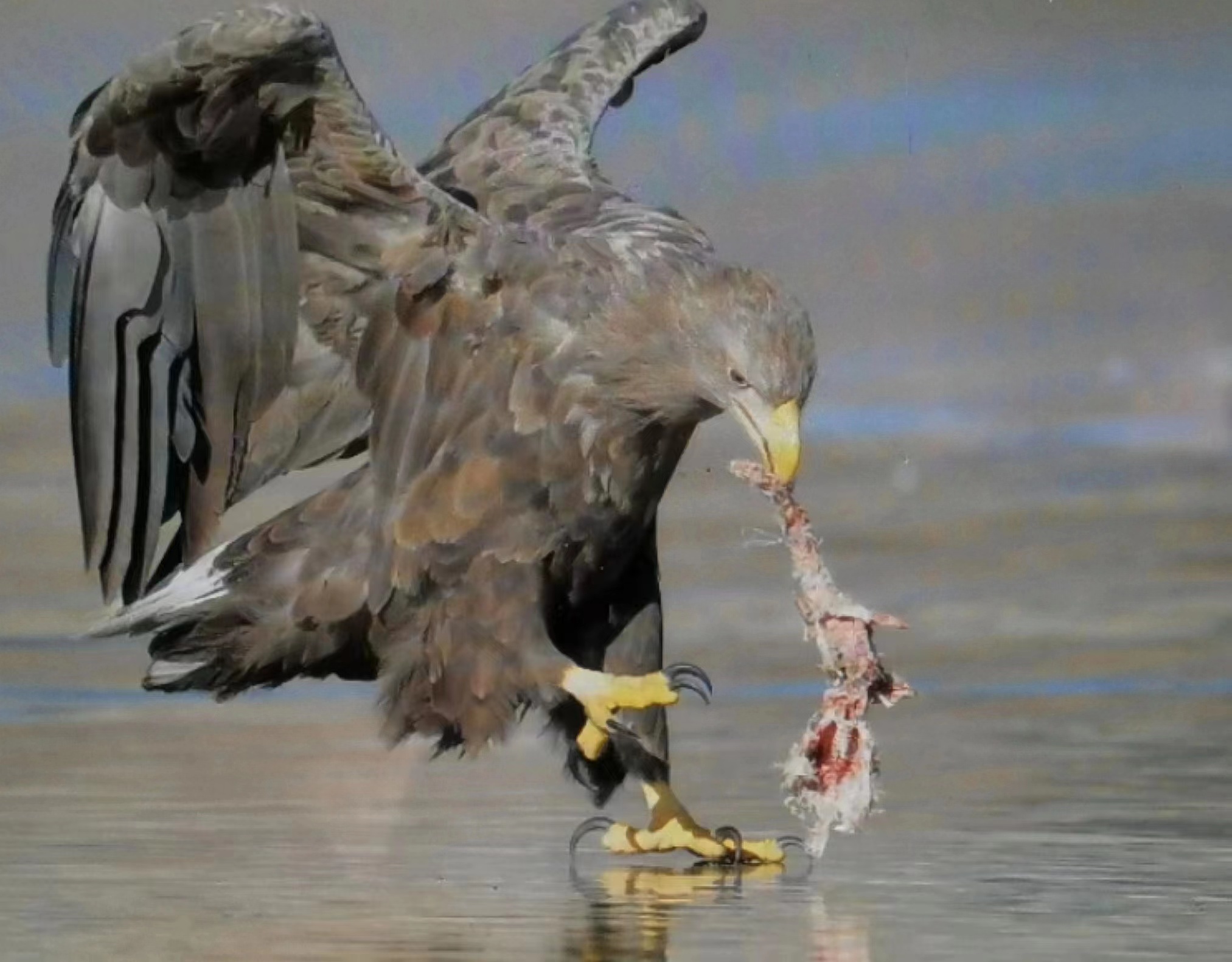 “这次发现了四只白尾海雕,两只成年大雕,两只三、四岁的小雕。”野生动物摄影师索丹罗珠告诉记者,白尾海雕捕食会在低空盘旋,发现鱼后缓速下降,接触水面一刹那会迅速将利爪伸入水中抓住猎物。白尾海雕喜欢在近水开阔空旷的草甸、沼泽等环境觅食活动,通常是单只或成对觅食,多只汇聚捕食较为罕见。