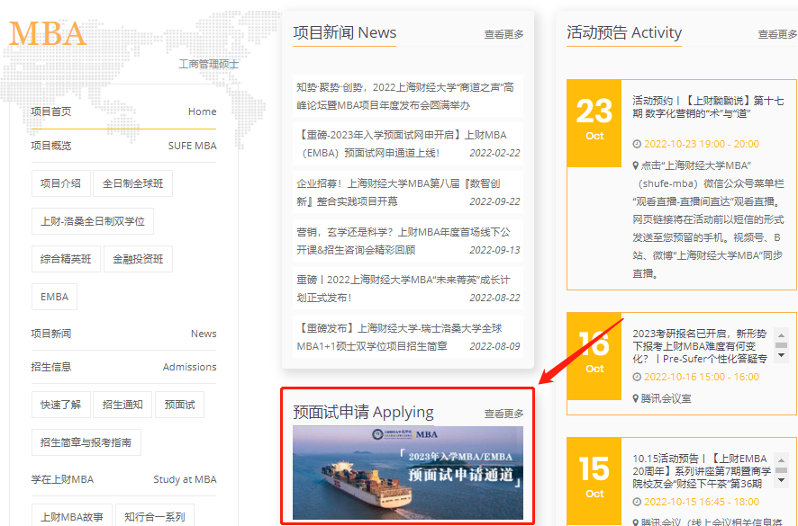 在上海财经大学MBA项目官网(https://cob.sufe.edu.cn/MBA)点击“预面试申请”(如红框所示)进入。