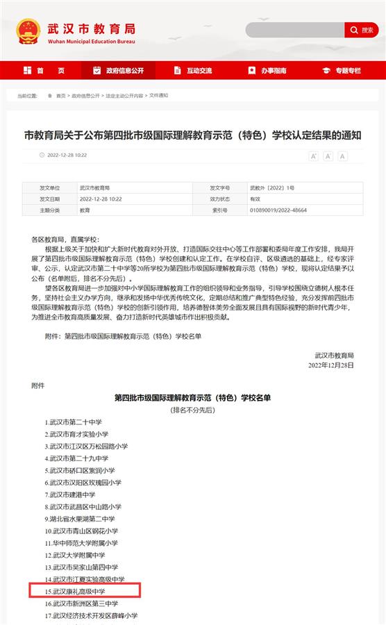 根据武汉市教育局武教外【2022】1号文件所示,经专家评审、公示、认定武汉市20所学校为第四批市级国际理解教育示范(特色)学校,已将认定结果予以公布。武汉康礼高级中学出现在此批示范学校名单中。