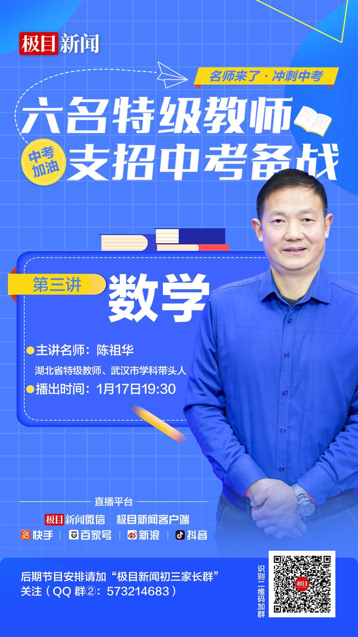 中考数学如何备战?冲刺中考需要注意哪些事项?快来听听特级教师怎么说。为帮助广大中考生科学备战中考,极目新闻特别推出“名师来了·冲刺中考”视频直播栏目,邀请六个中考科目的六名湖北省特级教师,云端指导考生和家长。本期节目主讲嘉宾是湖北省特级教师、武汉第三寄宿中学数学教师陈祖华。