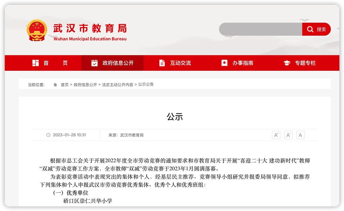 1月28日,武汉市教育局官网发布一则公示:全市教师“双减”劳动竞赛于2023年1月落幕,硚口区崇仁兴华小学、武汉市育才第二小学周晓菲、武汉市七十九中学吴艳玲、武汉二中广雅中学数学教研组等集体和个人拟被推荐为武汉市劳动竞赛优秀集体、优秀个人和优秀班组。