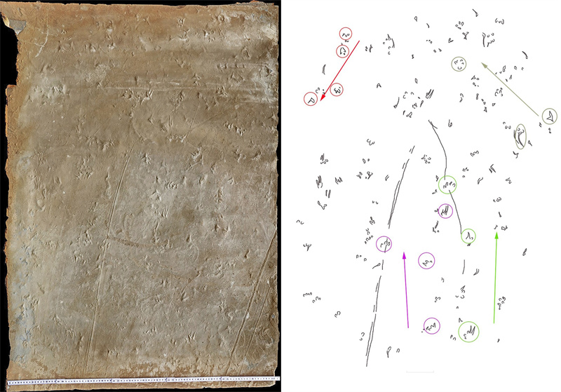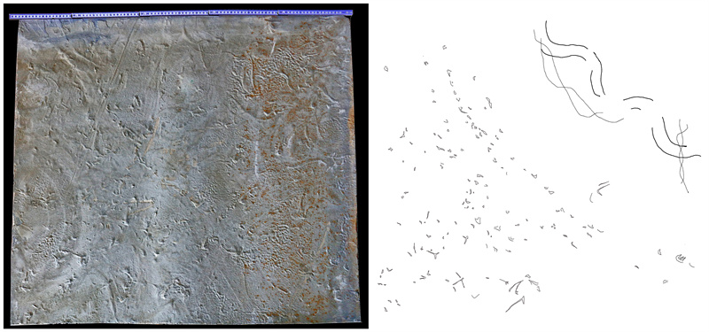 2006年,榆林当地民间收藏人士在距离庙沟村约6公里处的高崖畔村采石场区域又发现了30多块新标本。然而,在这些石板上不仅识别出了鱼类造迹,还存在大量疑似四足类动物留下的足迹。那么,到底是什么四足类动物留下的呢?