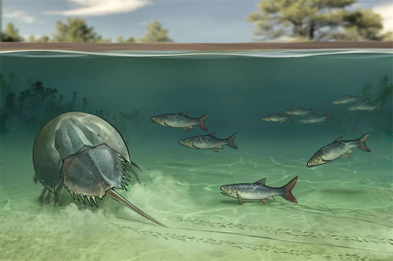 △复原图,晚三叠世晚期,身形巨大的鲎和辐鳍鱼类畅游于鄂尔多斯盆地浅水湖中(绘图:神棘)