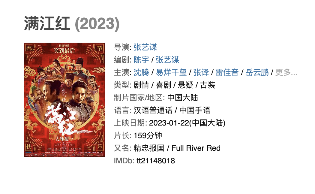 电影《满江红》的英文译名FullRiverRed,乍一看像是“满、江、红”对应的逐字翻译。不少网友认为其太过直白,诗词的韵味的丢失不少。但也有网友提出,在早期许多汉学家的作品中,“满江红”的翻译就是FullRiverRed。网友“@羊君医学翻译笔记”提到,美籍华人汉学家罗郁正的作品KueiHsing:ARepositoryofAsianLiteratureinTranslation(需要斜体,是英文书名)中,对“满江红”的翻译就采用了FullRiverRed。