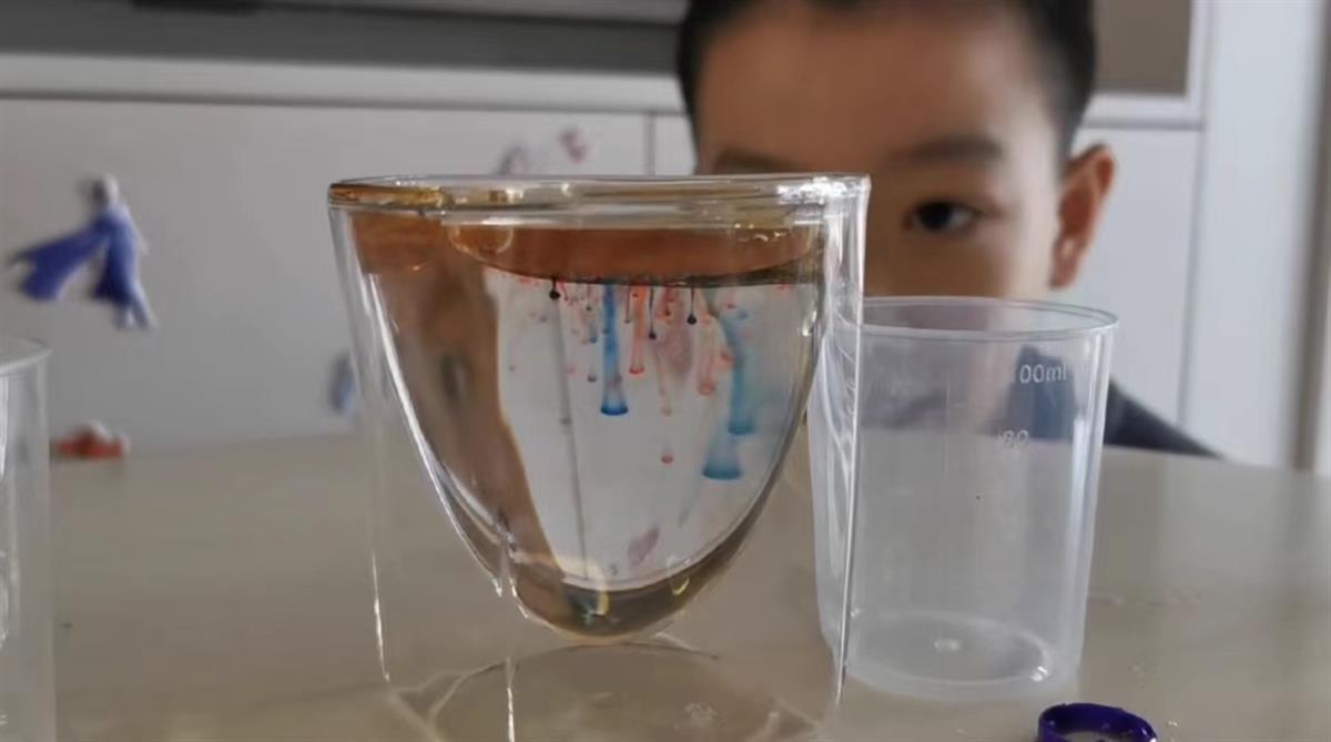 如果说杯中鞭炮效果一般般,邝煊朗还制作了杯中烟花——将食用油中滴入不同颜色色素搅拌均匀,然后混入有色素的食用油,全部倒入清水后静置10秒,就能看见漂亮的彩色烟花出现。