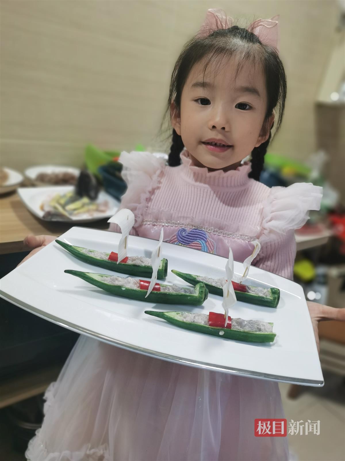 “制作这道菜我用到的材料有秋葵、大葱、红辣椒、虾泥、牙签。先把秋葵切开,把里面掏空,挤进腌制好的虾泥,这就是‘船身’;再把红辣椒切成小段,放在‘船身’中间,大葱白切段,用牙签串好插在红椒上,这就是扬起的‘船帆’;最后上锅蒸7分钟,这道菜就做好了。”肖语桐介绍,制作这道菜就像做手工,十分有趣。