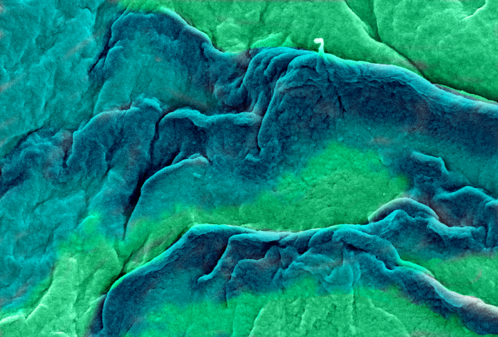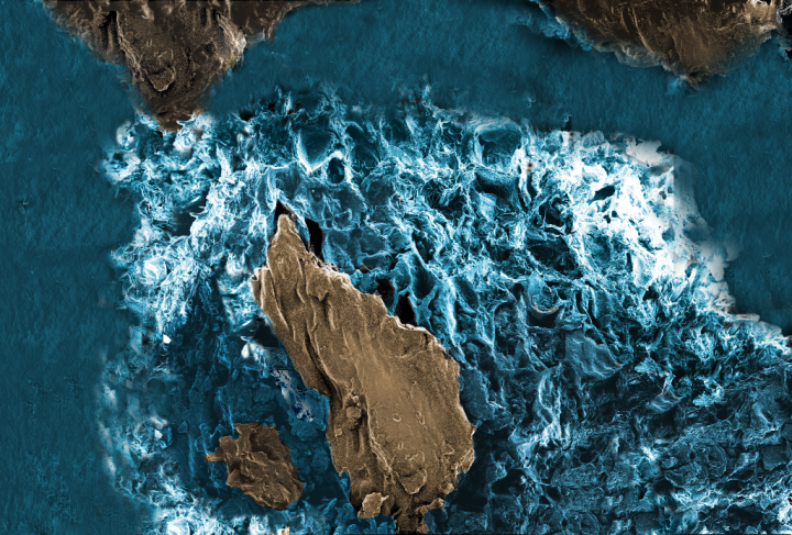 作品简介:该作品为未经处理的废弃咖啡渣的扫描电子显微镜照片,经过后期编辑处理呈现出高耸的碣石山和苍茫大海的画面。居高临海,视野辽阔,目睹壮阔风景,激发着我们内心的远大抱负,激励着我们要在这一领域创造更伟大的价值。