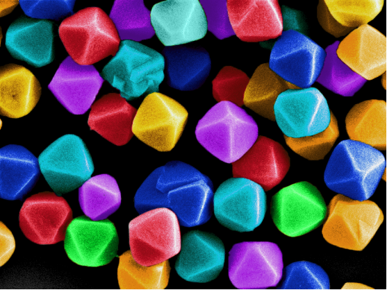 作品简介:UiO-66系列MOFs材料具有超大的比表面积、良好的孔结构和灵活可变的可调控性,因此在催化、功能材料和吸附等领域展示出巨大的应用前景。与大部分MOFs材料相比,UiO-66最大的优势就是具有极好的稳定性。在SEM(扫描电子显微镜)下我们可以观察到大部分微粒为较规则的正八面体结构,经调色处理后就像儿时小卖部的一种彩色巧克力糖,而其他一小部分MOF材料由于未完全聚合以及晶体生长缺陷等因素导致其外形残缺或者连接在一起,经调色处理后宛如粘连在一起的彩糖。
