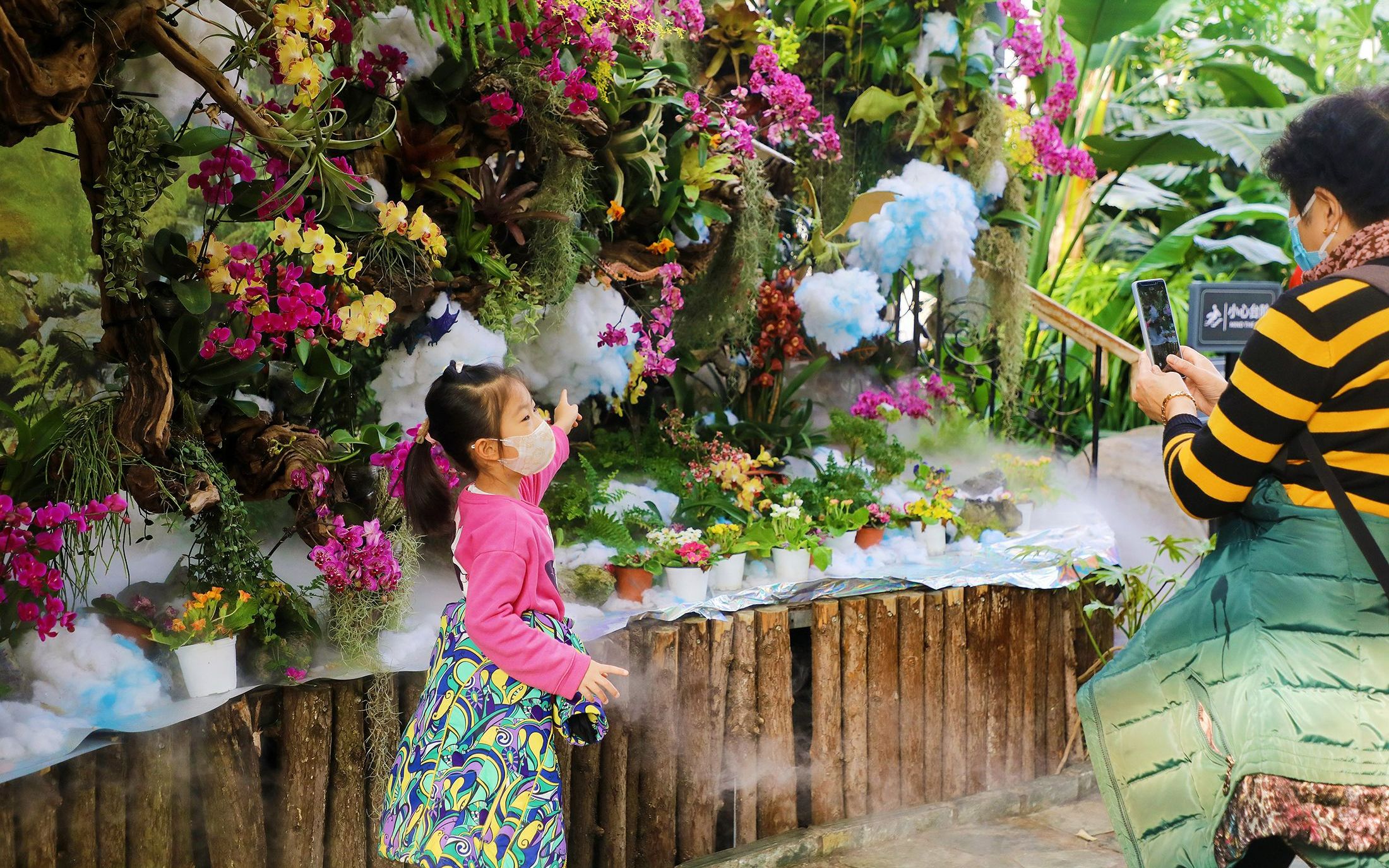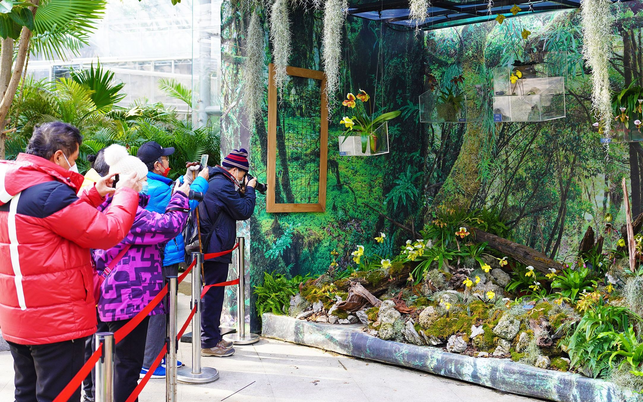 游客在国家植物园元宵兰花展的兰花生境区拍照。国家植物园供图
