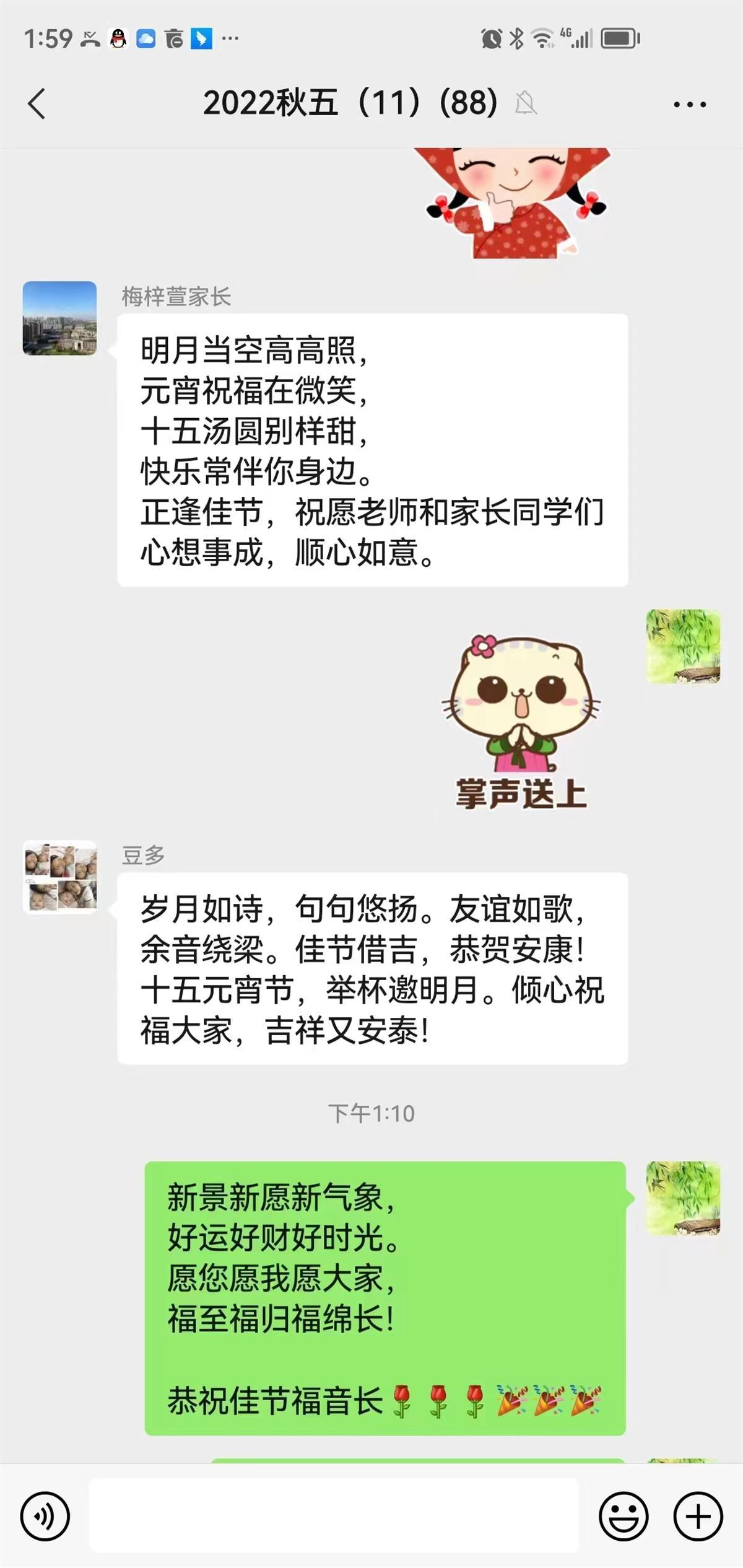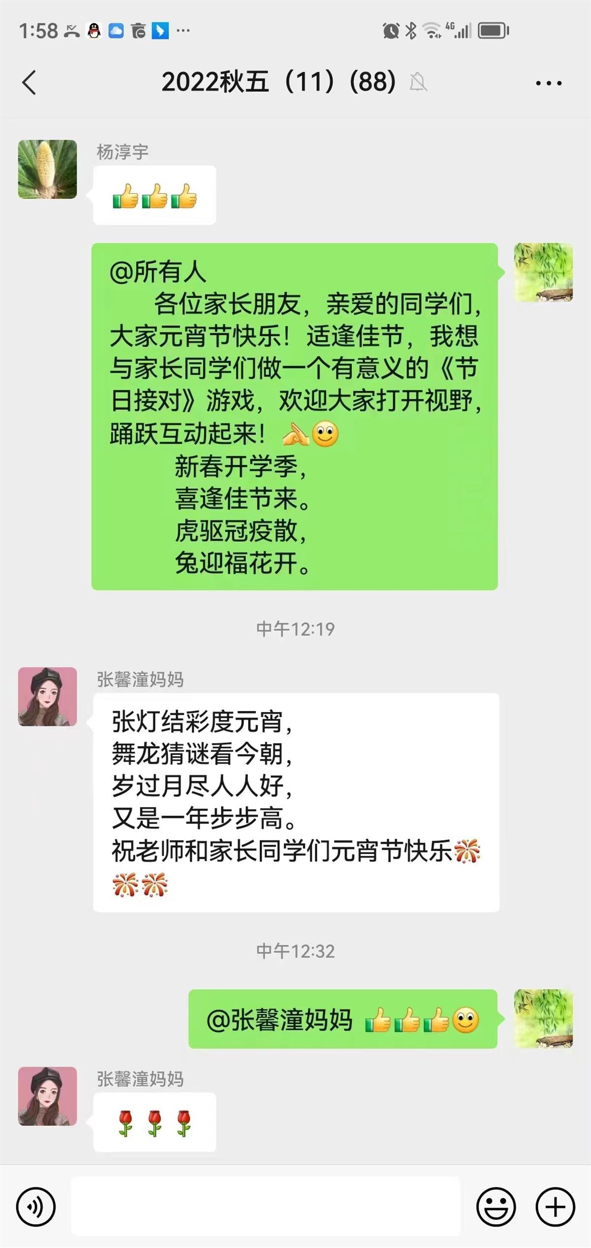 张馨潼妈妈抛出一首诗:“张灯结彩度元宵,舞龙猜谜看今朝,岁过月尽人人好,又是一年步步高。”高鑫磊同学立即接上:“天上的月儿圆,锅里的元宵圆,吃饭的桌儿圆,师生的情更圆!”何煜淇同学再接上:“正月十五元宵节,花灯逢元夜,今宵共团圆,元宵元宵,祸患全消,愿山河无恙,人间皆安,家圆月圆人团圆!”得到群里师生和家长们点赞。