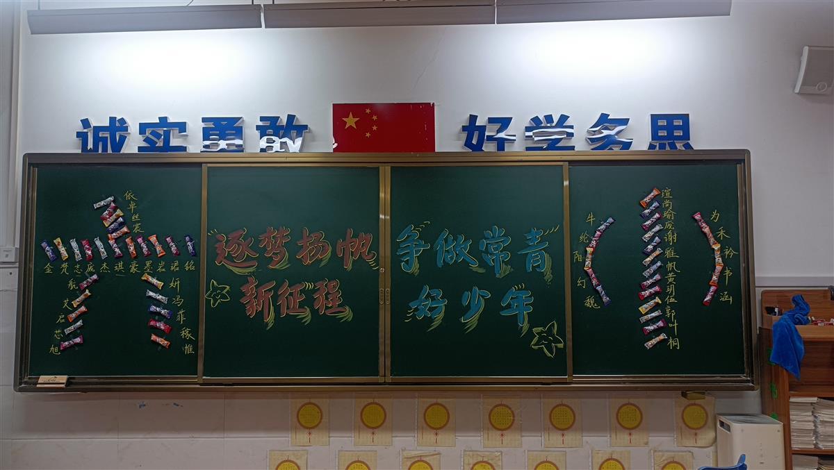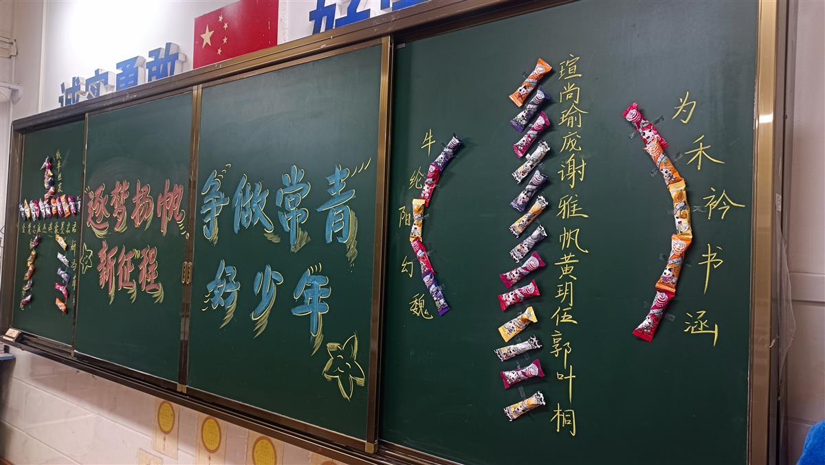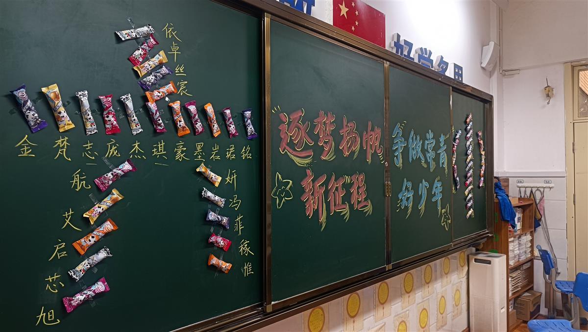 刘世佳介绍,开学前,她精心设计布置了教室,希望孩子们新学期努力向上、不负韶华。她在网上网购了4包棒棒糖,耗时两个小时布置了“六(1)”图案。“既要考虑位置是否合适,还要想谁的名字写在点、横、撇、捺上,都需要考量。”刘世佳说,她与副班主任易婷慧老师商量,并发挥她数学老师的特点,将数量、图形的对称、布局安排,终于将49名学生的名字安排上去。