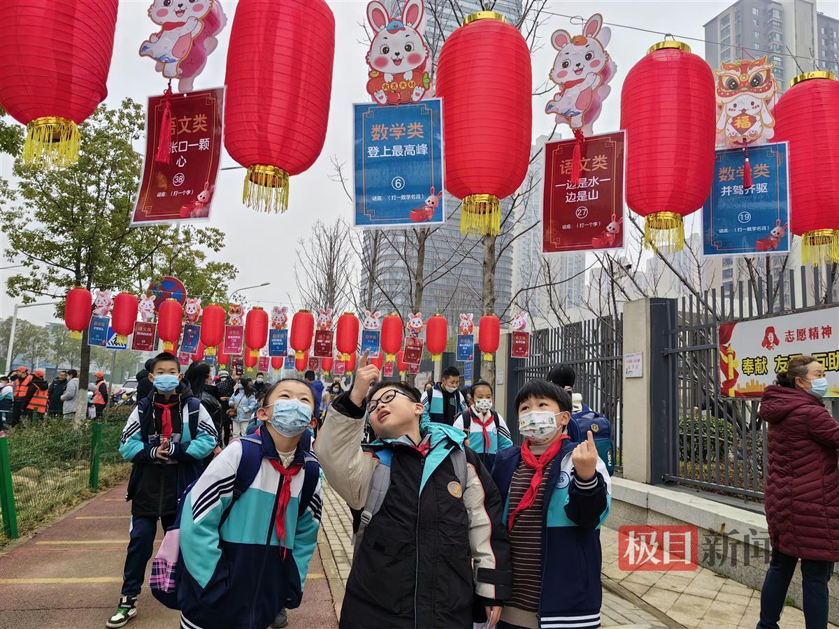 各校还为孩子们准备了更多“欢乐一刻”。武汉市汉阳区钟家村小学校舞蹈队的成员们创编了《开学啦》舞蹈,为同学们送去热闹和祝福;武汉市汉阳区郭茨口小学在校门口摆着趣味灯谜大闯关,学生们通过猜灯谜、展示寒假作业,集齐五只兔宝宝便可兑换玉兔徽章一枚及小礼品一个;在武汉市汉阳区七里小学,各班电子屏上有醒目的“兔个吉利红包墙”;在武汉市武昌区珞珈山小学,国家一级演员、著名相声表演艺术家陆鸣教起了学生说武汉话,引导大家传承和发扬地方特色,为家乡建设贡献力量,并和舞龙社团一道为全体学生送上新学期寄语——“踔厉奋发铭初心,笃行不怠勇前行”;昨日搬进新校园的武汉市硚口区崇仁燕园小学开展“美丽校园寻新记”打卡活动,今后两周,学生们将在熟悉校园的过程中收获大量惊喜。