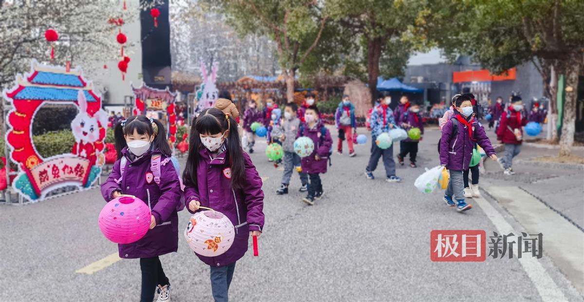 武汉市实验博雅第二小学五(1)班学生谭博文返校后就马上穿起吉祥“博雅兔”玩偶装,和老师们一起在校门口迎接学弟学妹,他说:“兔子多可爱呀!希望大家开学都有好心情。”在武汉市硚口区崇仁路小学,学生们戴着自制的小兔头饰,提着自制的小兔灯笼入校。武汉市江夏区文化路小学在校内展出了学生们的“纸盘新年兔”“扬眉兔气帽”主题的寒假“寻年味”劳动实践活动成果,学生们关于“兔”的想象力和创造力令老师们惊叹。武汉市青山区钢花小学在开学典礼上准备了一箱箱砂糖桔和大大的大白兔奶糖,祝福学生们新年“前兔似锦,桔祥如意”;在武汉市江夏区实验小学体育馆校区开学典礼上,学生们跳起了“兔子舞”……
