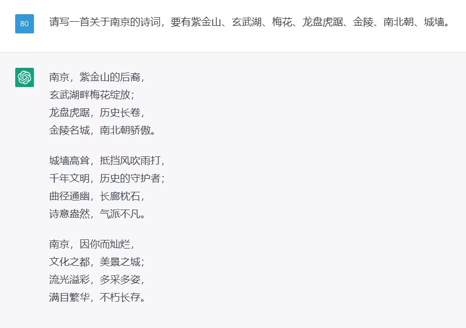记者尝试向ChatGPT发送了做诗的请求,要求要有“紫金山、玄武湖、金陵、南北朝、城墙”等南京元素。经过短暂5秒左右的“思考”,ChatGPT给出回应:“南京,紫金山的后裔,玄武湖畔梅花绽放;龙盘虎踞,历史长卷,金陵名城,南北朝骄傲”。记者继续追问这首诗参考了哪些内容,是否有版权纠纷。ChatGPT表示,这首诗通过模拟人类诗人的写作风格并利用机器学习技术生成的,不会带来任何版权纠纷问题。
