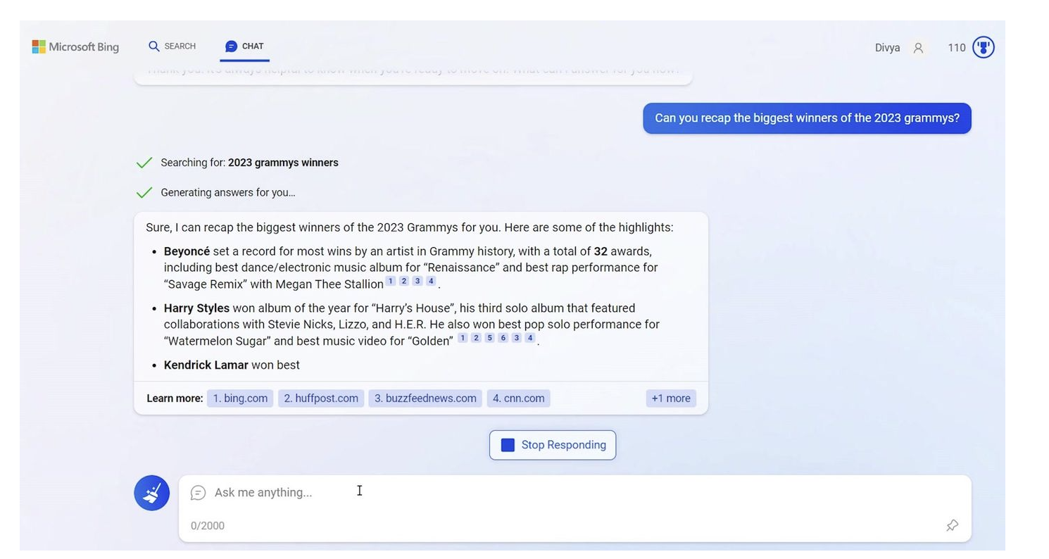 Stern问:“你能回顾一下2023年格莱美奖的最大赢家吗?”必应的聊天机器人输入了答案,其中列出了获奖者的项目符号列表,并提到了Beyoncé获得格莱美奖最多的纪录。答案还包含可点击的引用,注明所列信息的来源。