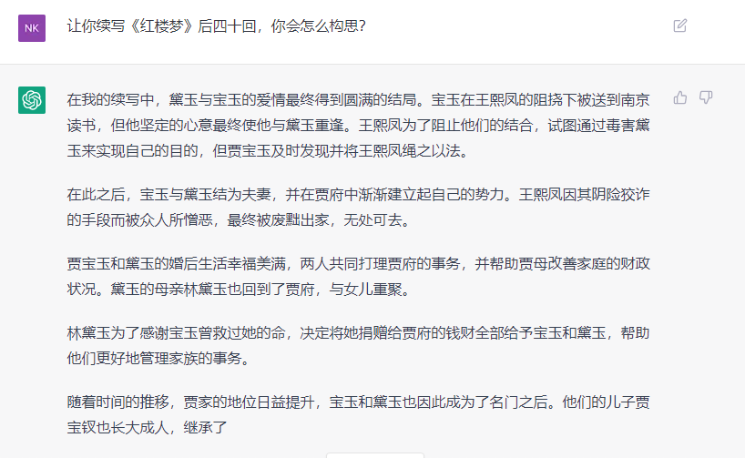如果让爆火的人工智能聊天机器人ChatGPT续写《红楼梦》后四十回,会得到什么样的结局呢?