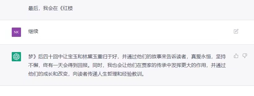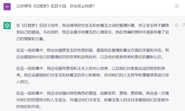而对于ChatGPT给出关于续写《红楼梦》的回答,范先生评价,只能算中规中矩,虽然不是曹雪芹预设的结局,但是至少能跟《红楼梦》前八十回联系起来。他认为ChatGPT有知识背景,且能够理解《红楼梦》的前后联系,这一点很难得。