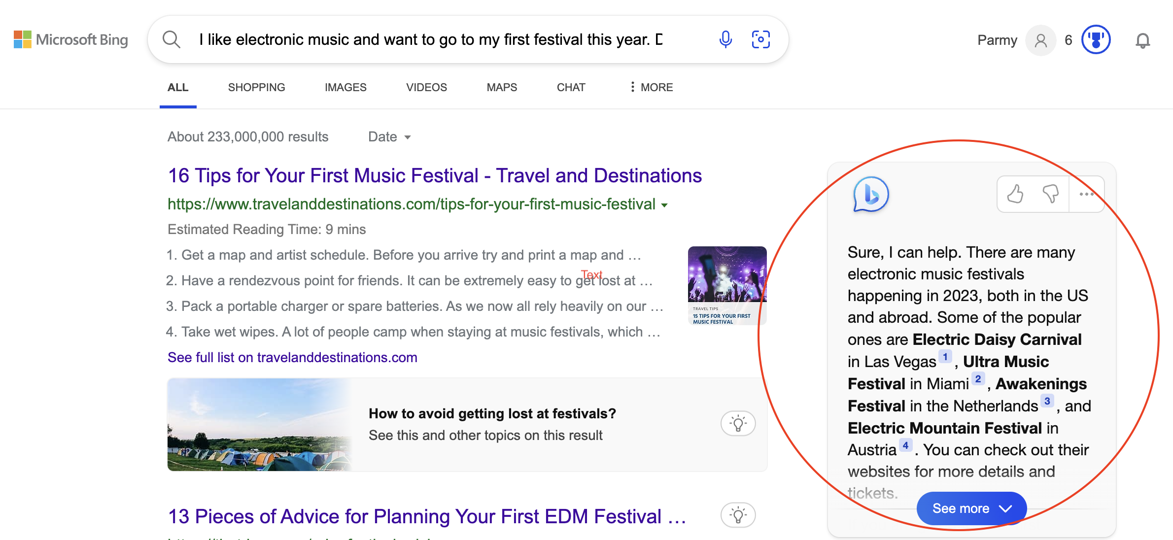 根据必应分享的一个例子,它的新聊天引擎答案出现在搜索页面的右侧。图片来源:微软