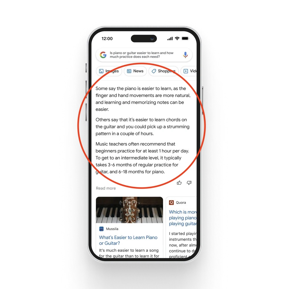 也许演示中最有趣的一点是,谷歌展示了它在未来将如何使用生成式人工智能从网络中总结信息。在演示中,谷歌展示了对“观星时最适合寻找的星座是什么?”这一问题的搜索。人工智能生成的回答突出了几个关键选项以及如何发现它们。