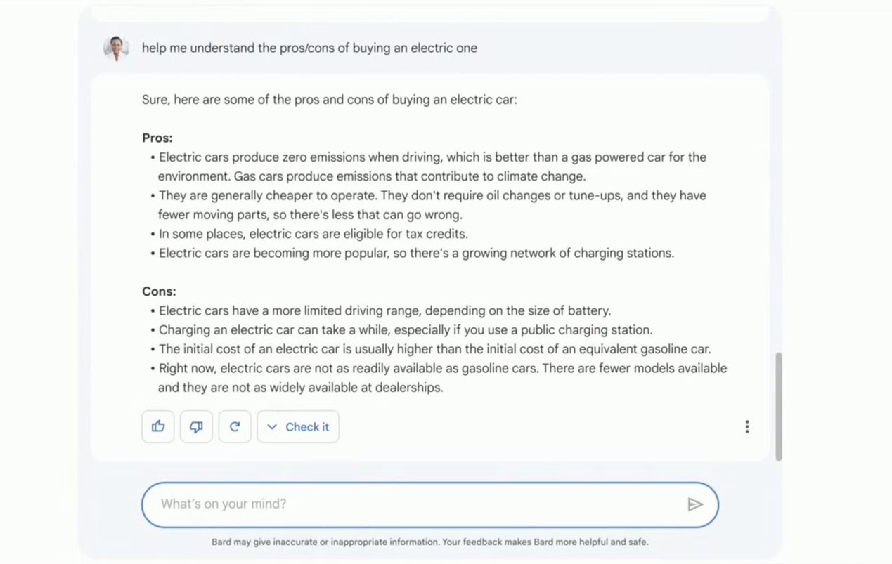 在直播演示中,谷歌演示向巴德询问有关购买电动汽车的利弊的问题。图片来源:谷歌