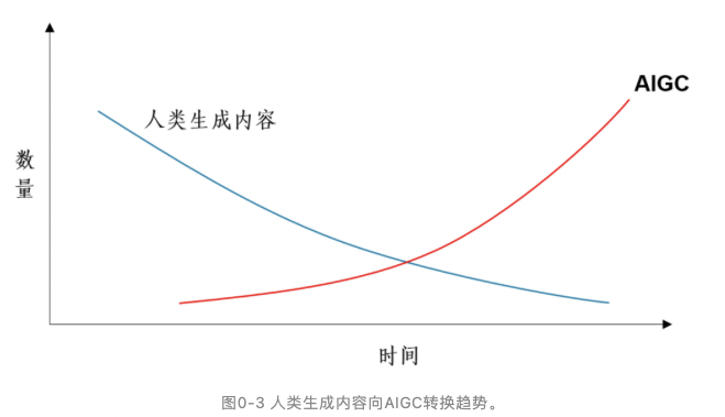 第五,AIGC开创了“模型”主导内容生成的时代。人类将跑步进入传统人类内容创作和人工智能内容生成并行的时代,进而进入后者逐渐走向主导位置的时代。这意味着传统人类内容创作互动模式转换为AIGC模型互动模式。2022年是重要的历史拐点(见下图):