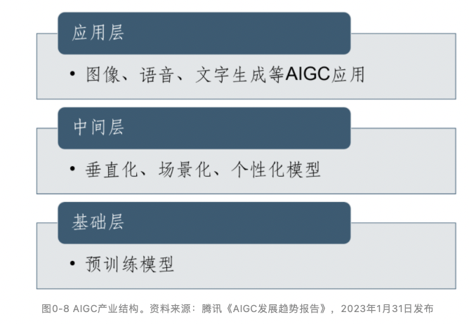 第十一,AIGC催生出全新产业体系和商业化特征。AIGC利用人工智能学习各类数据自动生成内容,不仅能帮助提高内容生成的效率,还能提高内容的多样性。文字生成、图片绘制、视频剪辑、游戏内容生成皆可由AI替代,并正在加速实现,使得AIGC进而渗透和改造传统产业结构。“在产业生态方面,AIGC领域正在加速形成三层产业生态并持续创新发展,正走向模型即服务(MaaS)的未来”(见下图):