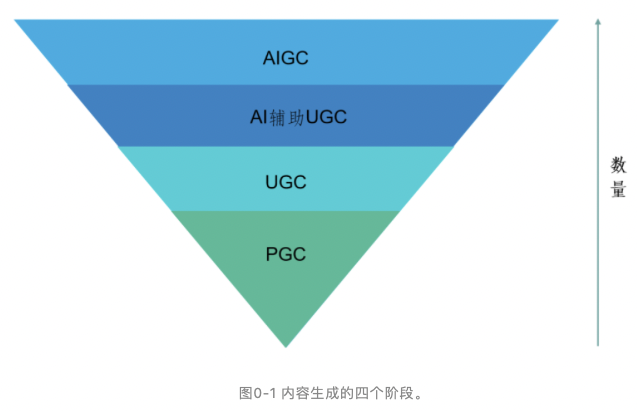 内容生产赋予了Web2.0的成熟和Web3.0时代的来临。相较于PGC和OGC、UGC,AIGC通过人工智能技术实现内容生成,并在生成中注入了“创作”,意味着自然智能所“独有”和“垄断”的写作、绘画、音乐、教育等创造性工作的历史走向终结。内容生成的四个阶段(见下图):