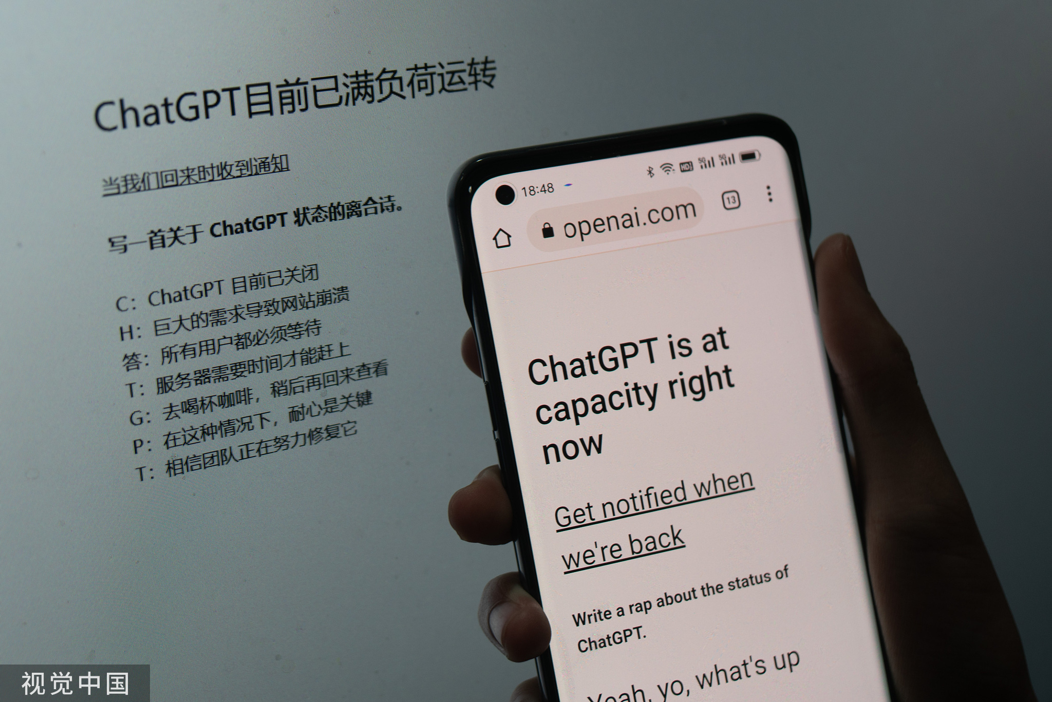 2023年2月6日,上海,一位年轻人使用手机和电脑访问OpenAI的网站,显示ChatGPT目前已满负荷运转,已关闭服务,用户可要求ChatGPT在恢复服务时收到电邮通知。视觉中国图