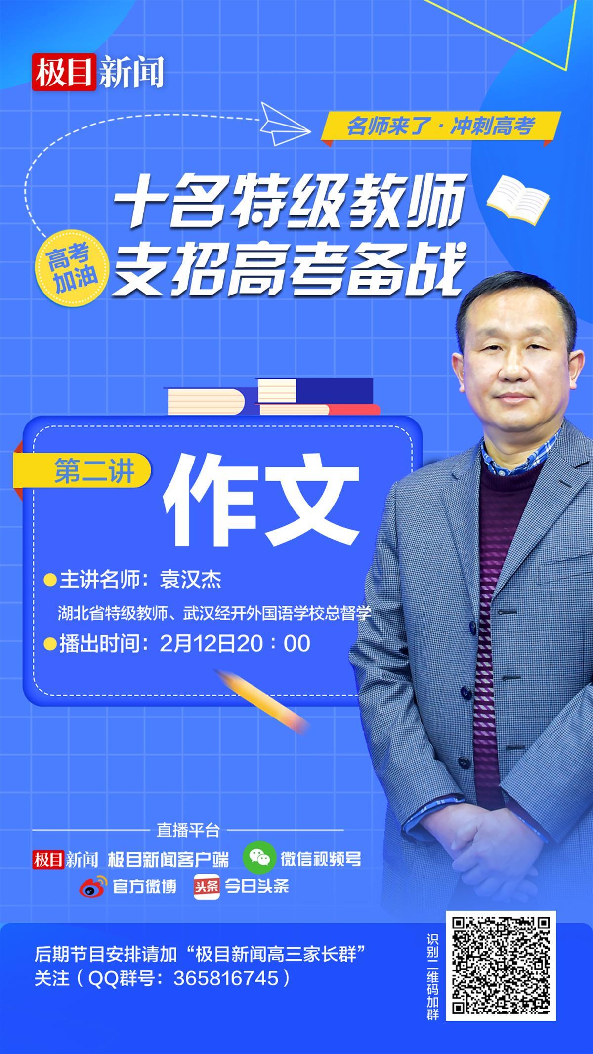 2月12日20:00(周日晚上8时),极目新闻推出“名师来了•冲刺高考”系列公益讲座第二场,邀请湖北省特级教师、武汉经开外国语学校总督学袁汉杰,为高考考生讲解高考作文备考技巧。节目将通过极目新闻微信视频号、官方微博、客户端、头条号等平台直播。