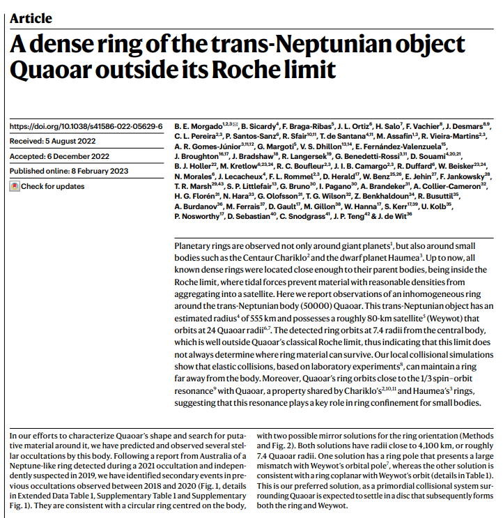 大火的《流浪地球》系列不断在给科幻迷们灌输一个天体物理学概念:洛希极限。天体之间保持安全距离大家就相安无事,要是安全距离被打破,那么地球就会被木星潮汐力撕碎;那么两个天体间的距离在几倍于洛希极限距离之外呢?2月8日,一篇《自然》论文描述了天文学家此前一次奇特的发现。通过掩星观测手段,科学家们发现太阳系一颗名叫创神星的矮行星不仅有一个环,且它的环与母星间的距离超过了7个行星半径,即洛希极限的两倍多。