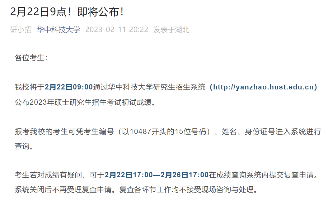 华中科技大学将于2月22日09:00通过华中科技大学研究生招生系统(http://yanzhao.hust.edu.cn)公布2023年硕士研究生招生考试初试成绩。考生若对成绩有疑问,可于2月22日17:00-2月26日17:00在成绩查询系统内提交复查申请。
