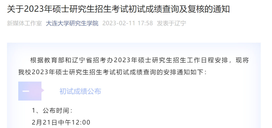 根据研究生招生工作安排,学校2023年硕士研究生招生考试初试成绩将于2月22日公布。查询开通时间为2月22日09:00。成绩复核申请受理时间为2月22日-2月24日。