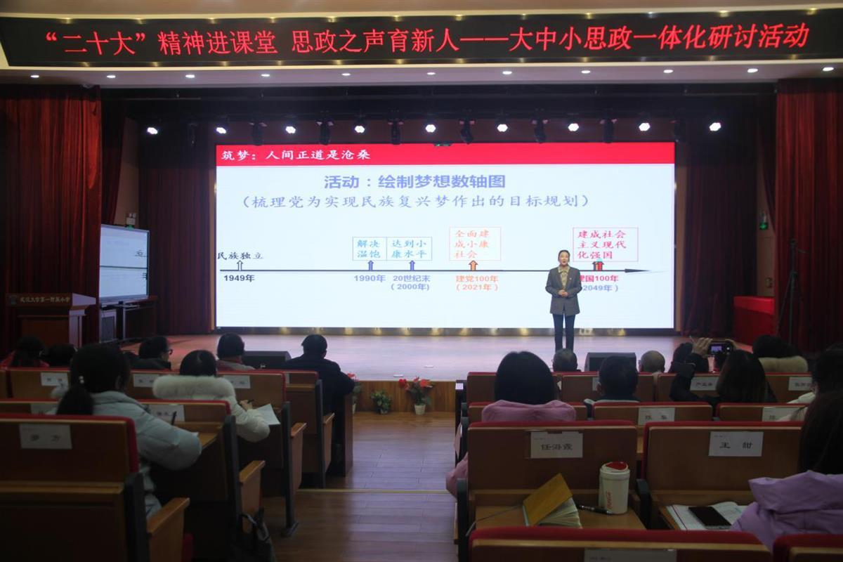 武大外校思政教师陈炎炎围绕《我们的梦想》,以启梦、筑梦和圆梦三个环节层层递进,引导学生从历史的视角绘制梦想数轴图,深层理解中国梦的内涵,将思政元素与知识教学有效融为一体,做到“有情而抒、有感而发、有据可依”,做到了思政课“有温度”。