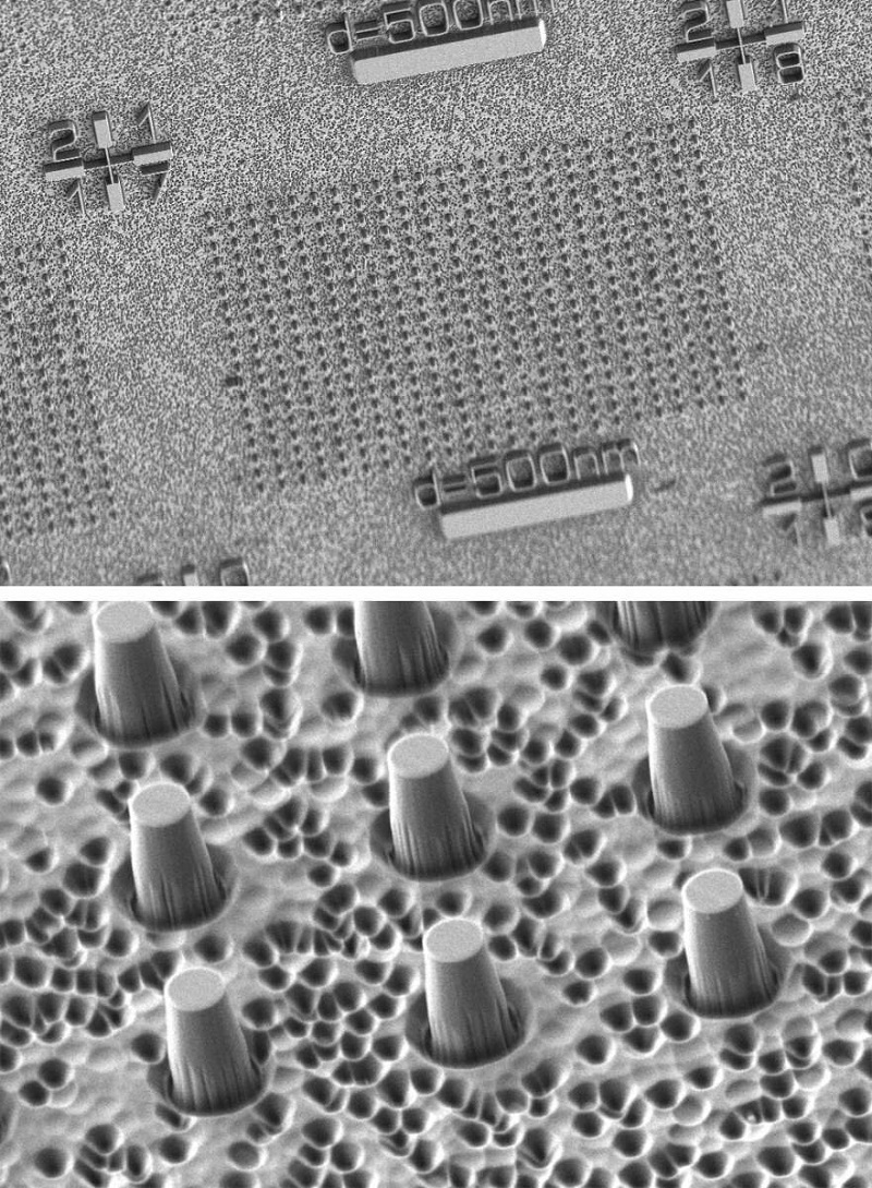 实验装置:一个30微米厚的金刚石膜,每个柱子的顶部有一个传感器,放大2640倍(上)和32650倍(下)。图片来源:维兹曼科学研究所