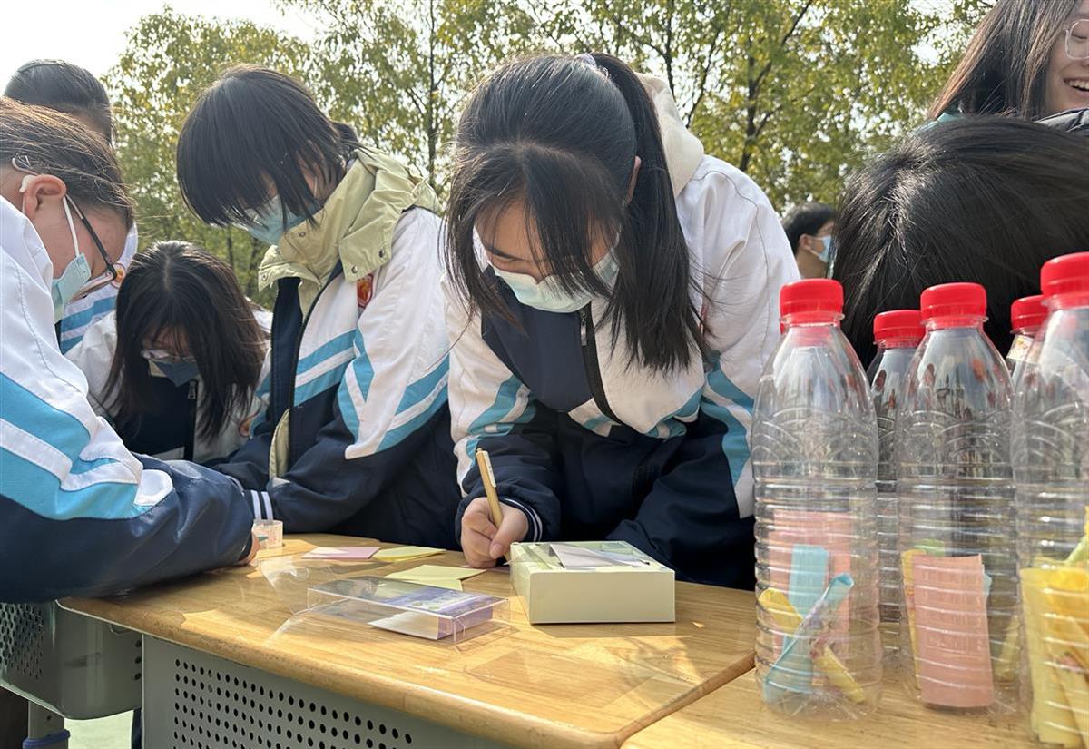 “我想考上中国公安大学,日后成为一名警察”“我想考清华美院,继续学习美术”……在时光漂流瓶环节中,学生们在便利贴上写下了自己的心愿,将心愿纸条放入矿泉水瓶中。极目新闻记者在现场看到,不少学生写下了自己的中考目标和人生规划,还有不少学生为同学和家人许下了心愿。