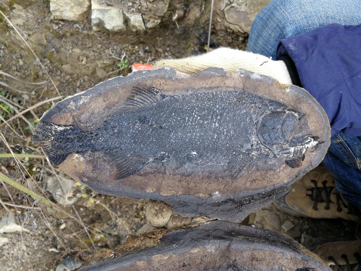 代旭对两次出野外的经历记忆犹新。第一次是2018年,他在贵州出野外的时候,在小树丛边,目光一瞥突然看到旁边灰岩层上几条平行排列蓝色的条状物,直觉告诉他应该是化石。他立马趴下仔细观察,确切无疑是脊椎动物的骨骼,但是不确定是鱼类的刺还是爬行类的肋骨。然后,他向其它队员大喊“快过来,这里有好东西!”当时,其他成员还不怎么相信,因为代旭在野外曾这样幽默地活跃气氛。于是等代旭再次大喊后大家才半信半疑走过来。这次四个人一起合力花了一下午时间把这块标本挖了出来,是一条长约80厘米的腔棘鱼,“这也是最近报道的贵阳生物群中的顶级捕食者。”