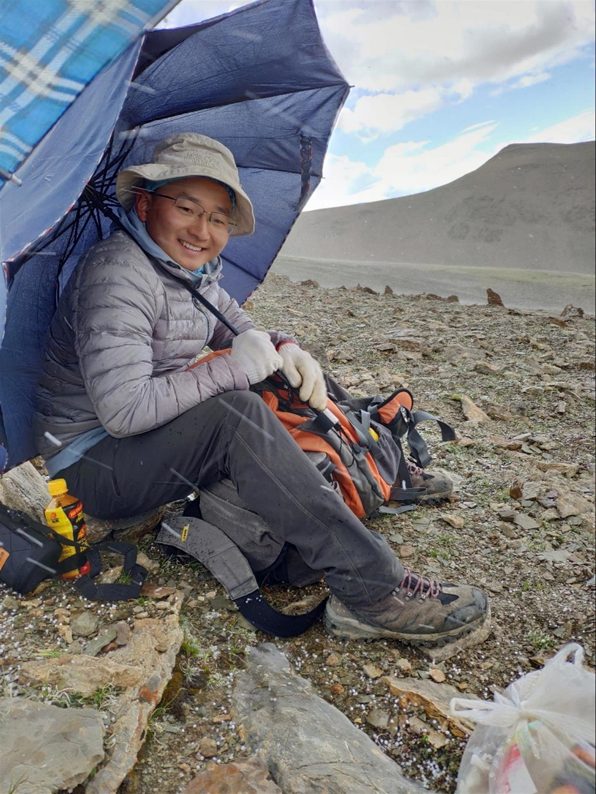 代旭2019年在西藏希夏邦马峰北坡野外工作时躲避冰雹