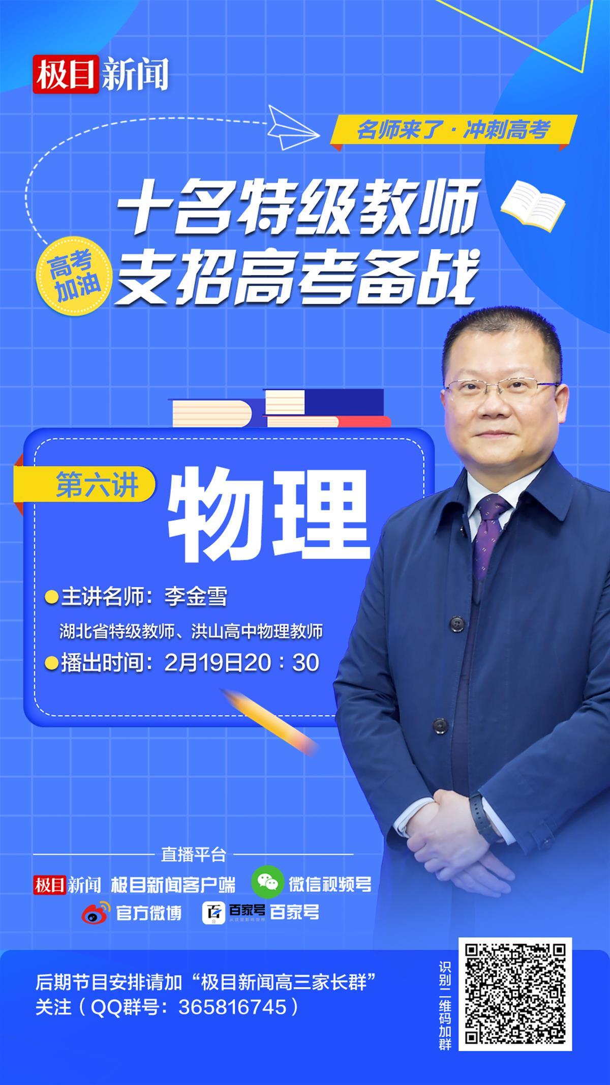 2月19日(周六)20:30,极目新闻“名师来了•冲刺高考”系列公益讲座第六场,邀请湖北省特级教师、2021年度“荆楚好老师”、武汉市洪山高级中学物理教师李金雪,为高考考生讲解高考物理备考技巧。本期节目将通过极目新闻微信视频号、官方微博、客户端、百家号等平台直播。