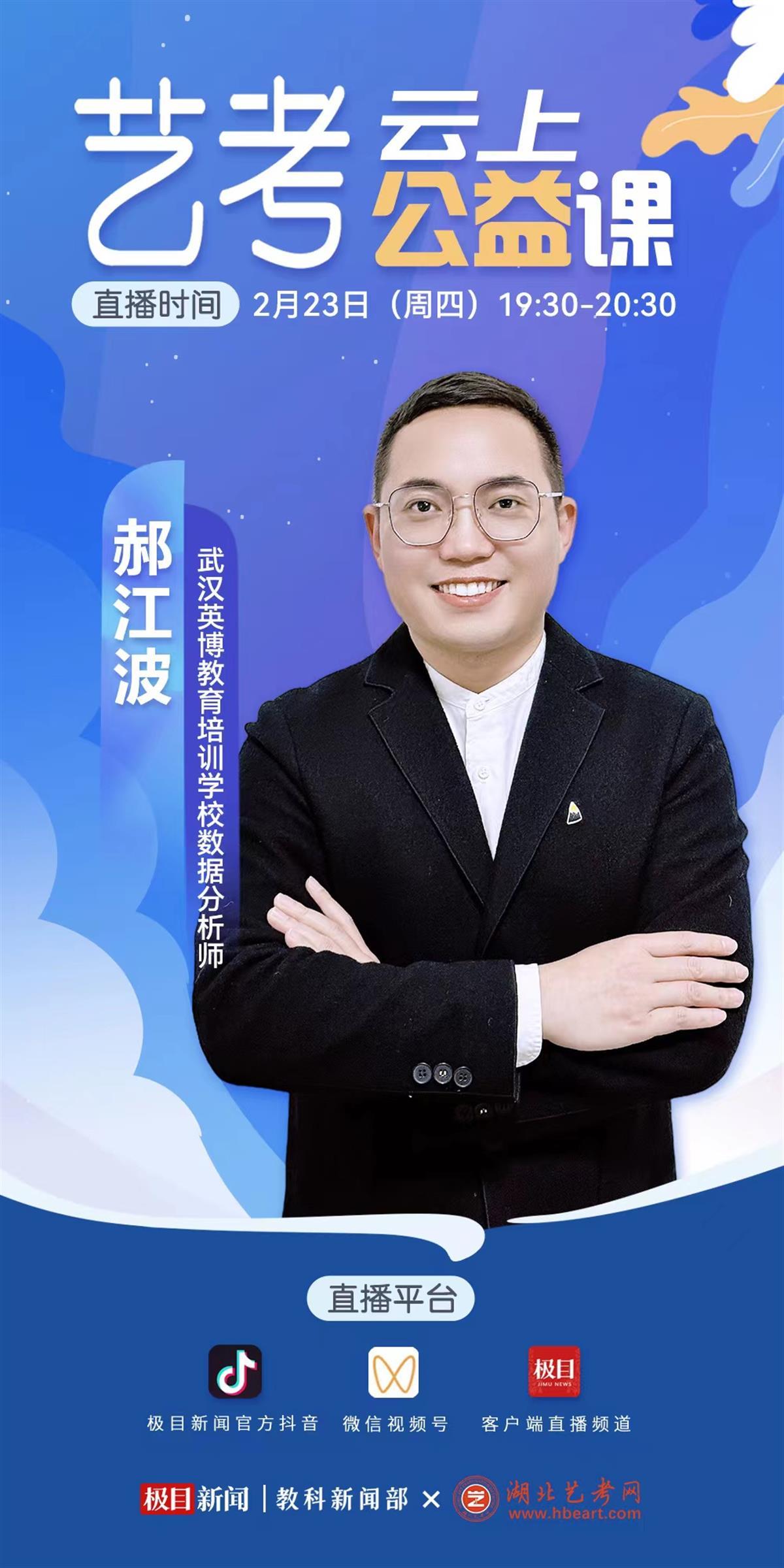 2月23日(周四)19:30——20:30,武汉英博教育培训学校数据分析师郝江波,将走进本次“艺考云上公益课”对广大艺考生进行备考指导。