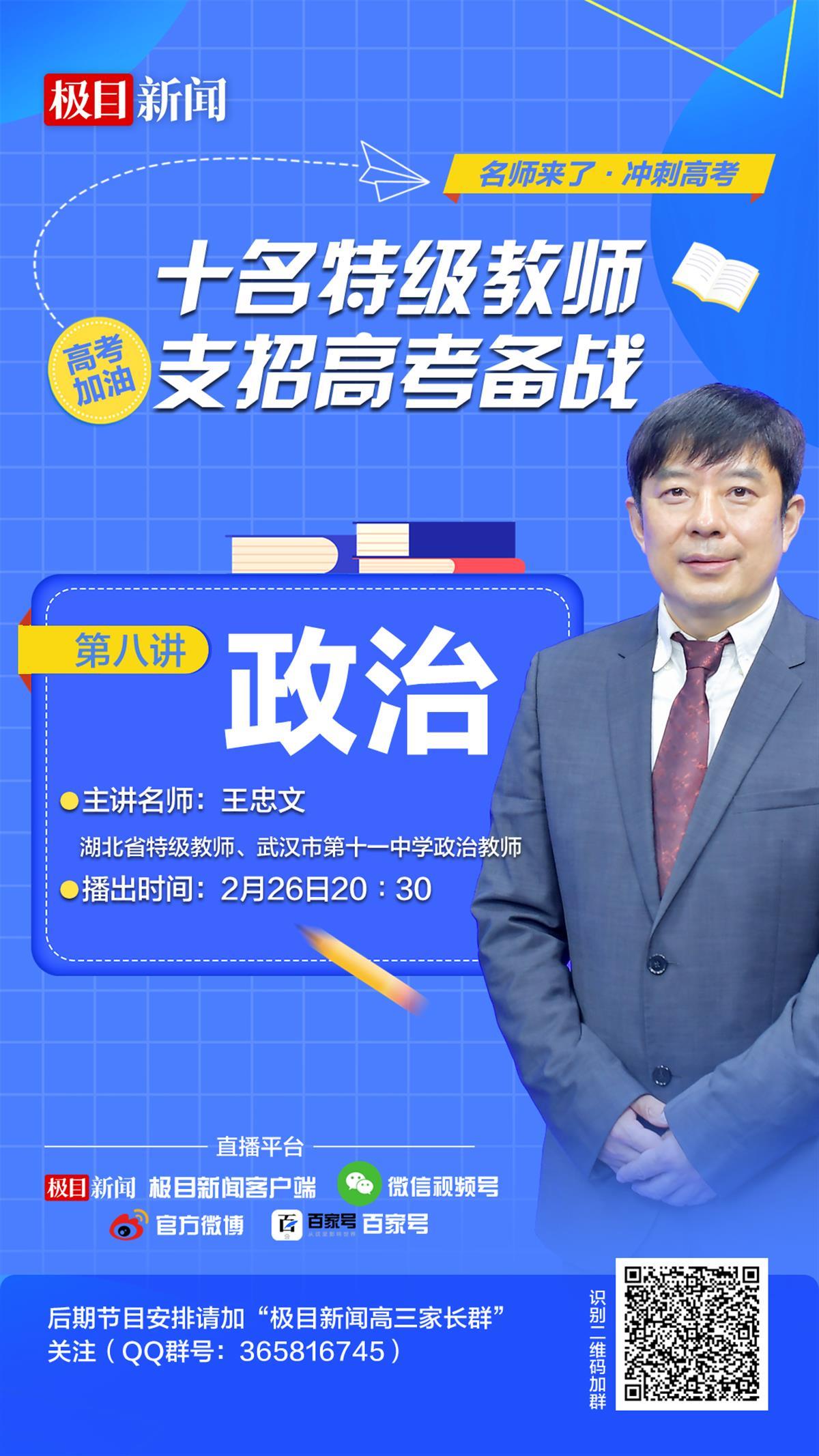 2月26日(周日)20:30,极目新闻推出“名师来了•冲刺高考”系列公益讲座政治专场,邀请到的嘉宾是教育部思政培训专家、湖北省特级教师、武汉市第十一中学政治老师王忠文。节目将通过极目新闻微信视频号、官方微博、客户端、头条号等平台直播。