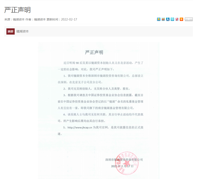 根据声明,这家镜湖资本公司的全称为深圳市镜湖投资咨询有限公司。